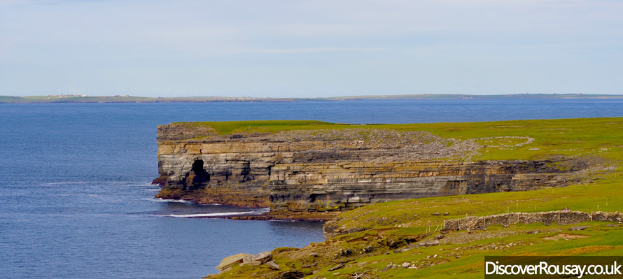 Divert across to The Brings, where large cracks and natural arches in the rocks under the cliffs blow air when the winds are high, and continue past Rousay's highest cliff,
